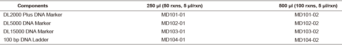 This product consists of double-stranded DNA fragments of specific molecular weight and is mixed with loading buffer containing a blue dye, which can be used as standard reference in agarose gel electrophoresis. All the fragments in the DNA Marker/Ladder are obtained by enzymatic digestion and purification. The bands are more clear during electrophoresis and the mass ratio between the bands is more accurate. The 750 bp fragment in the DL2000 Plus DNA Marker, the 1,000 bp fragment in the DL5000 DNA Marker and the 500 bp fragment in the 100 bp DNA Ladder are at a concentration of 100 ng/5 μl, which are bright bands; all the remaining fragments are at a concentration of 50 ng/5 μl.
